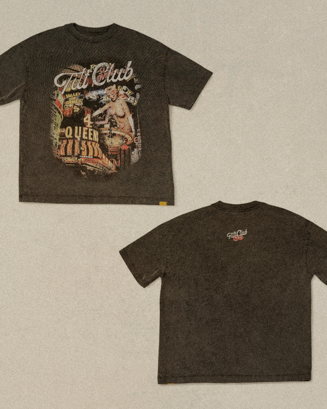 A unique piece paying homage to the illuminating grandeur of Sin City. Men’s stonewash t-shirt with Tilt Club 4 Queens graphic printed on front and Tilt Club graphic below collar on back.