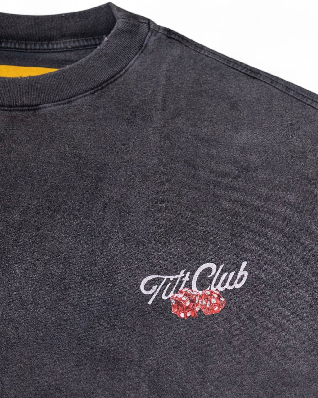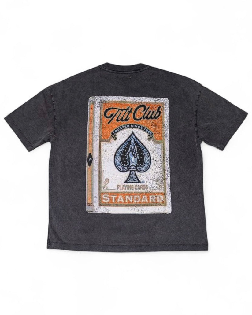 An iconic symbol of Sin City, the deck of cards, features in this exclusive piece. Men’s stonewash t-shirt with a deck of playing cards graphic printed on the back and the Tilt Club graphic on the front right chest.