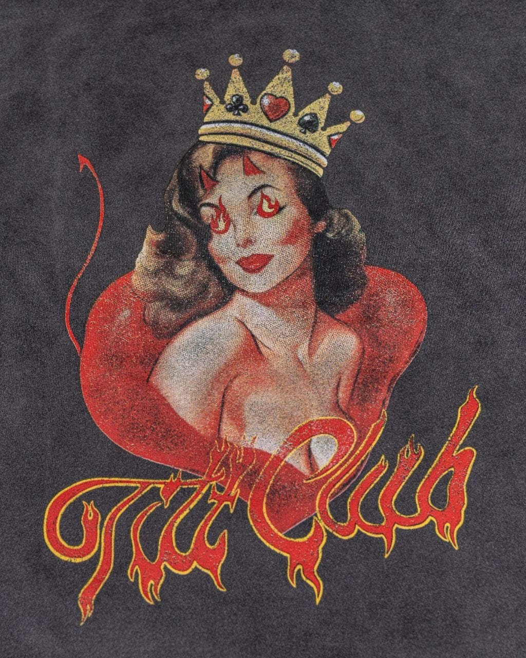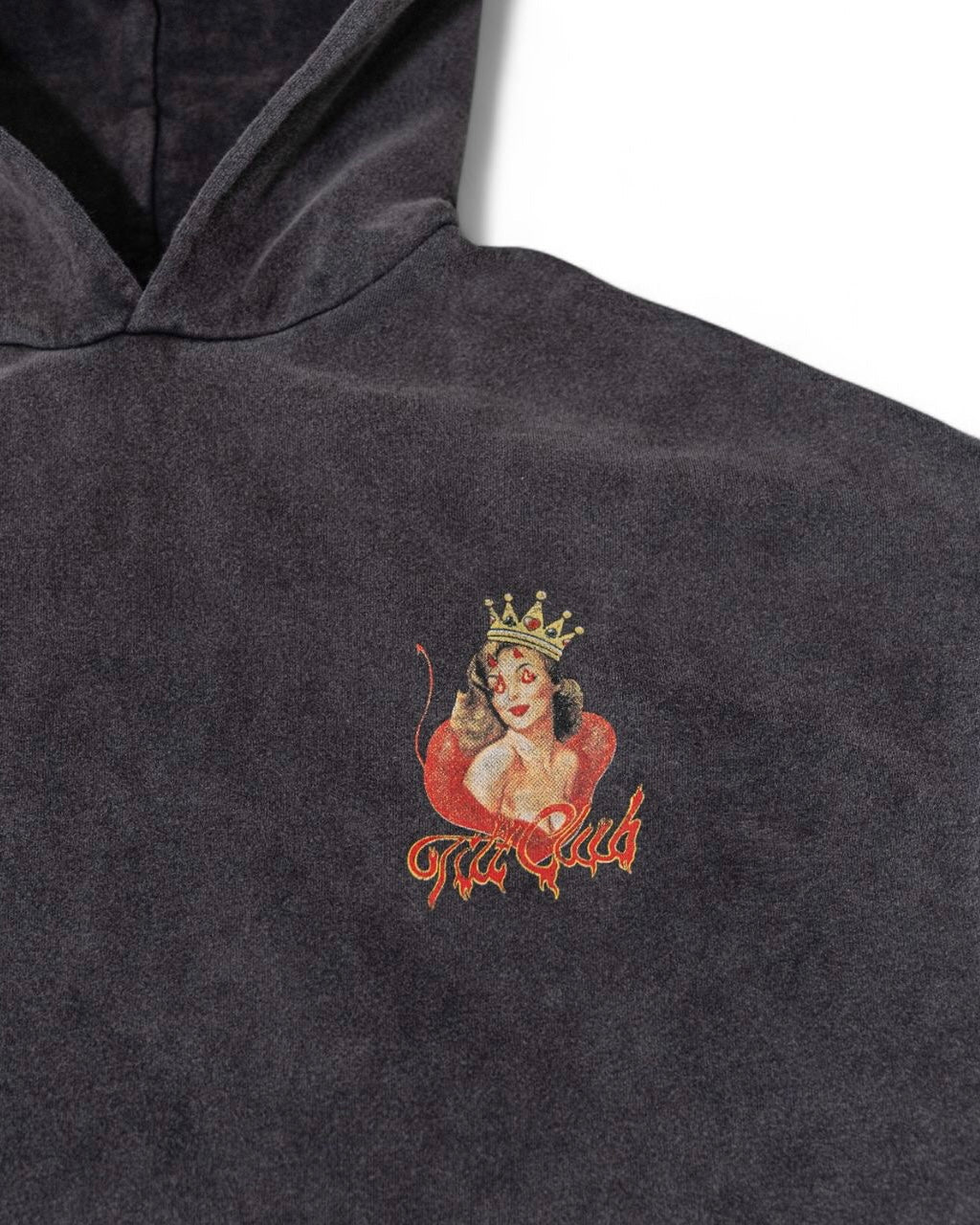 What happens in Tilt Club - this piece is our nod to Sin City’s moniker. Men’s stonewash hoodie with pouch pocket, devil show girl graphic printed on the back and the devil show girl printed graphic on the front right chest.