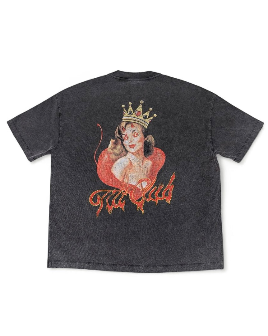 What happens in Tilt Club - this piece is our nod to Sin City’s moniker. Men’s stonewash t-shirt with devil show girl graphic printed on the back and the devil show girl printed graphic on the front right chest.