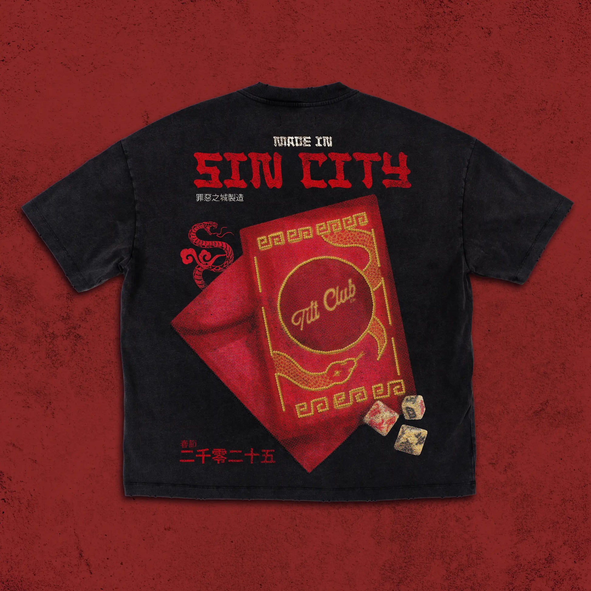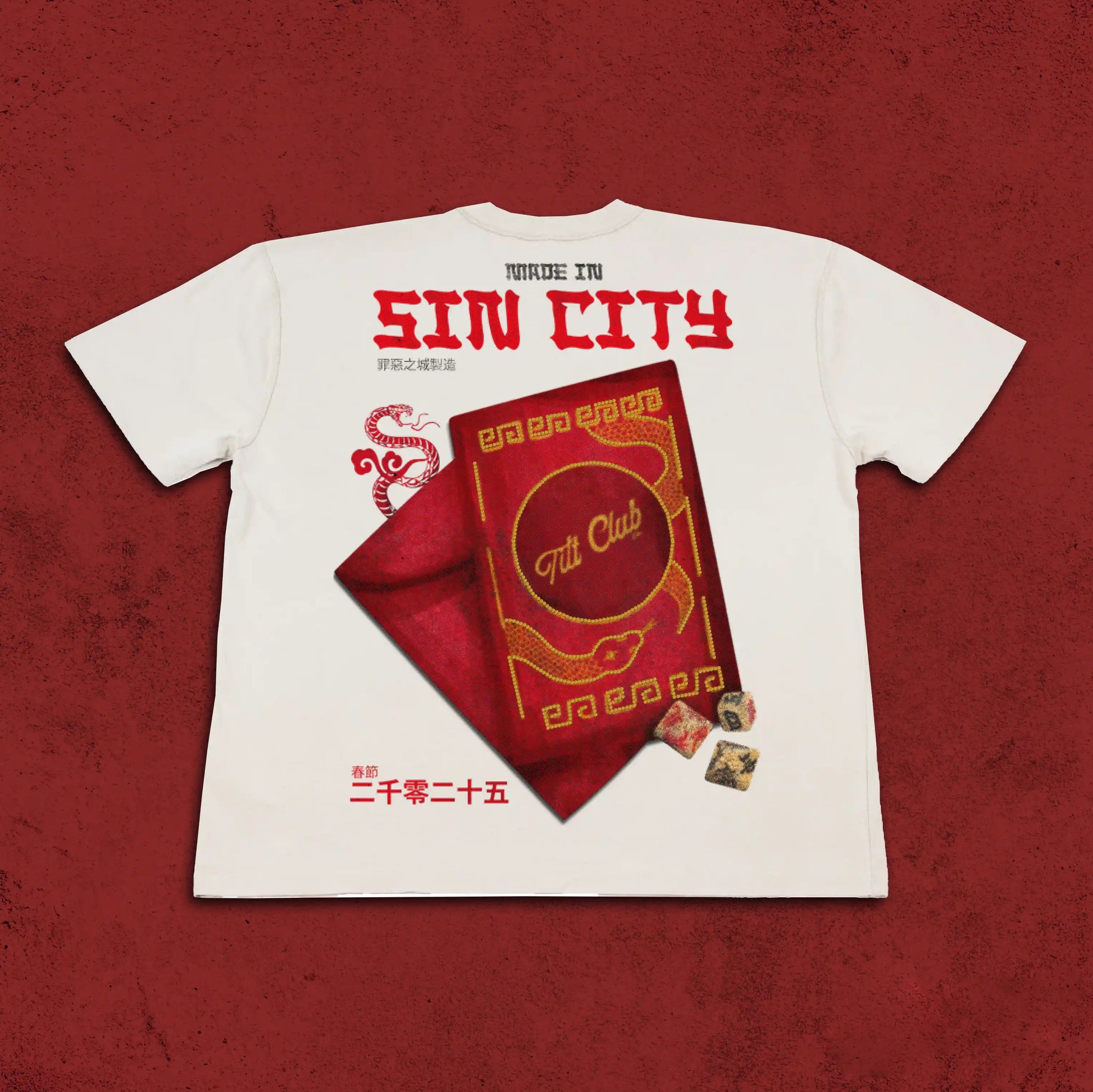 Inspired by high-stakes nights and the mystique of Sin City, the Envelope T-Shirt blends culture and casino energy into a striking design. The back features a bold red envelope with intricate gold detailing, symbolizing fortune and risk. The Tilt Club logo is embedded within the ornate patterns, while gold rhinestones add a touch of luxury. Chinese-inspired typography and dice complete the artwork, capturing the thrill of the game.