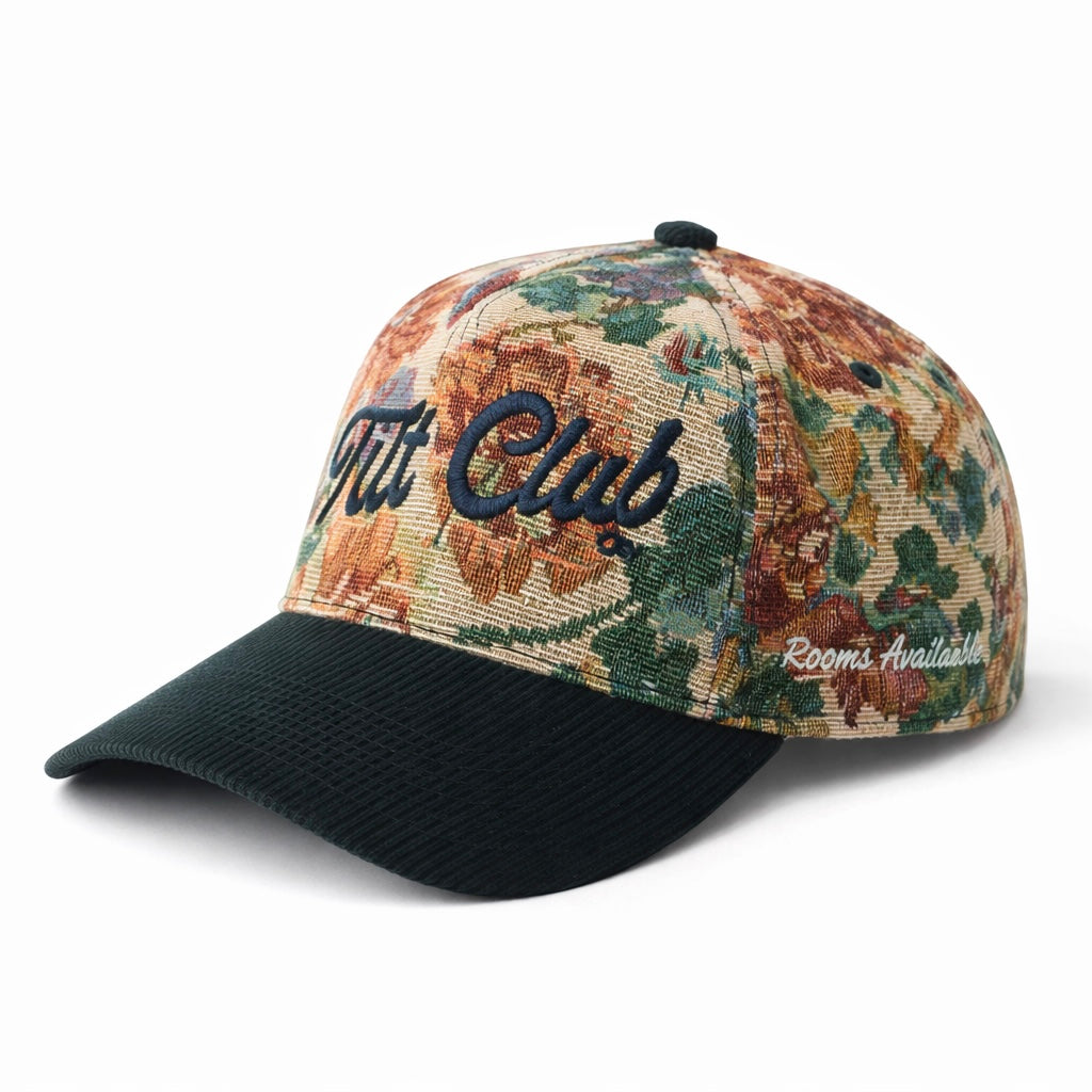 Woven tapestry crown inspired by classic hotel carpets, casino interiors, and late-night lounge décor. Embroidered Tilt Club branding and subtle side details, it feels collected rather than produced.